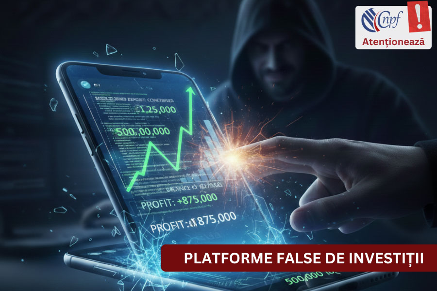Comisia Naţională a Pieţei Financiare (CNPF) avertizează asupra unor tentative de fraudă online prin platforme false de investiţii, care folosesc numele şi imaginea unor entităţi autorizate şi a unor persoane publice pentru a crea impresia de legitimitate. Escrocii utilizează anunţuri sponsorizate pe reţelele de socializare (Facebook, Instagram) care promit profituri nerealiste.